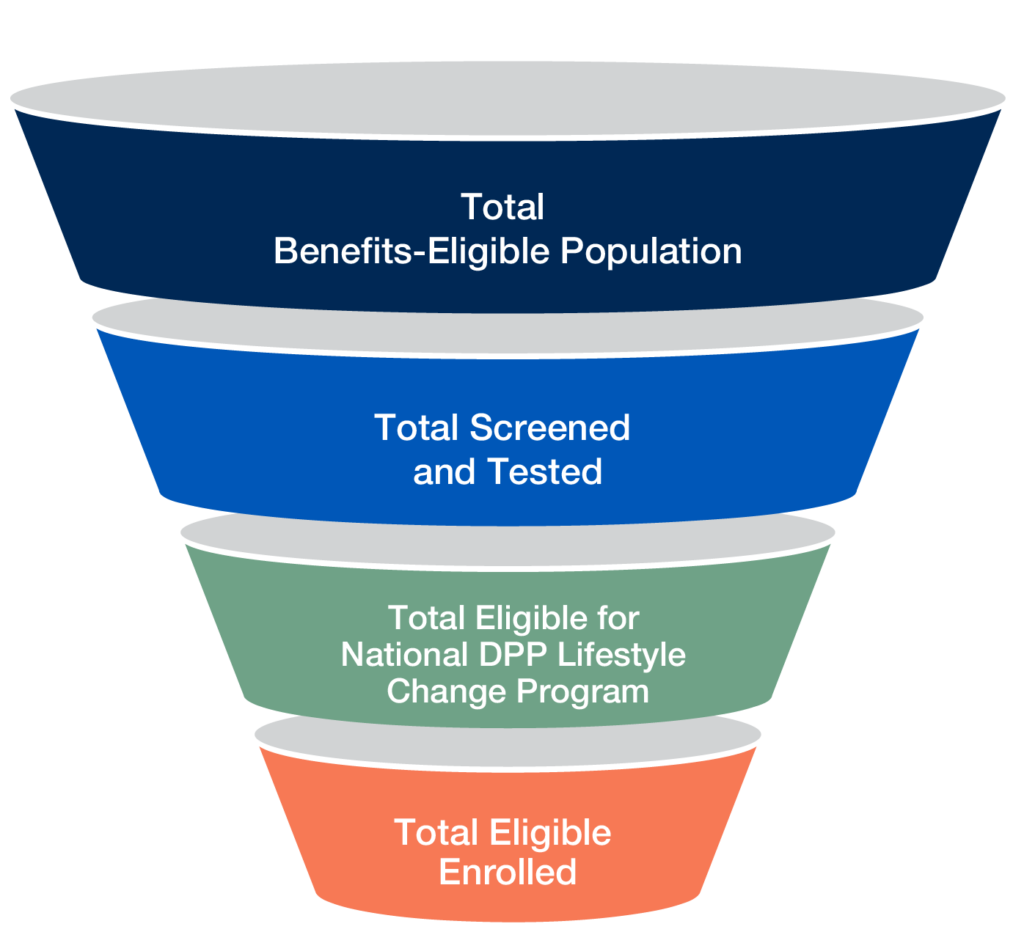 Consider your identification and enrollment process as a funnel. Begin with your entire benefits-eligible population and encourage as many as you can to get screened or tested for prediabetes. Use the screening results to determine the total number of employees eligible to participation in the National DPP lifestyle change program. Refine your employment goals based on the number of eligible employees.